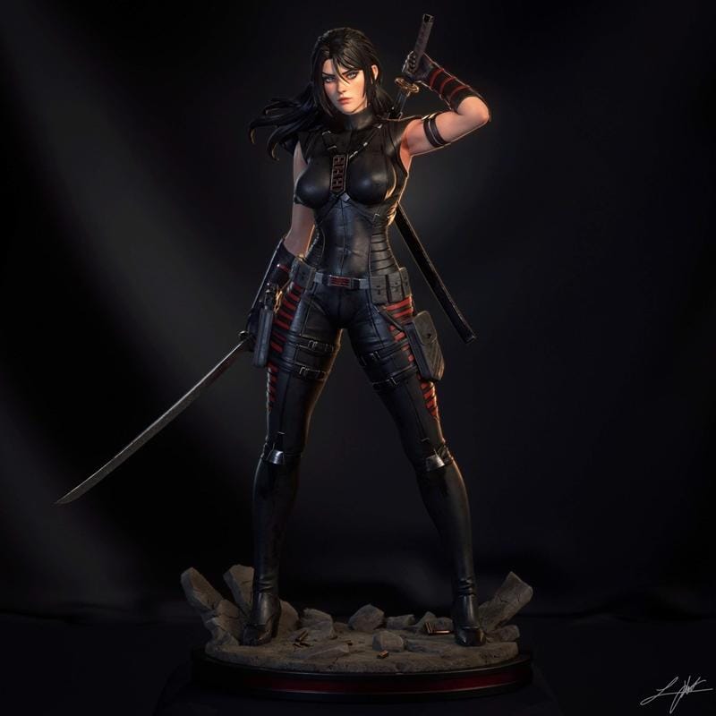 This highly detailed 3D printable model from Abe3D features a dynamic portrayal of Snake Eyes II, a formidable character from the G.I. Joe universe. The figure is depicted in a striking action pose, clad in a sleek, tactical black suit accented with red detailing. She wields a katana in one hand, with another sheathed on her back, and a pistol holstered at her hip, showcasing her readiness for combat.