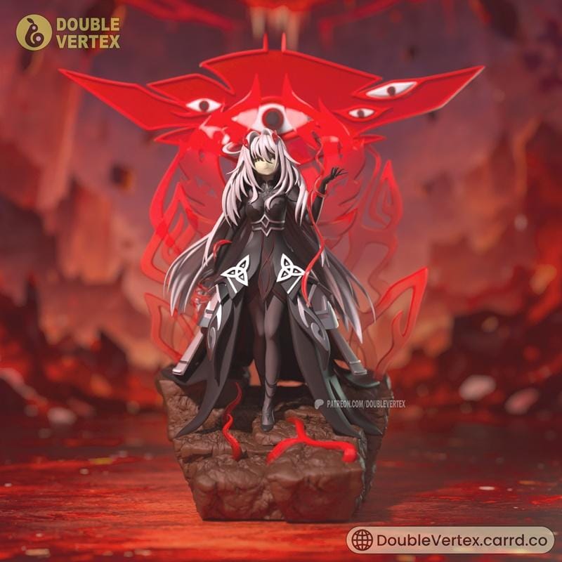 This highly detailed 3D printable model captures the enigmatic character Ronova from Genshin Impact, brought to life by Double Vertex. The figure stands poised on a rocky, diorama-style base, adorned with fiery red accents and tendrils that evoke a sense of dark power. Ronova herself is depicted in a striking black and grey outfit, featuring intricate patterns and a flowing cape. Her long, white hair and piercing gaze, combined with the ominous red entity looming behind her, create a dramatic and visually captivating display piece.