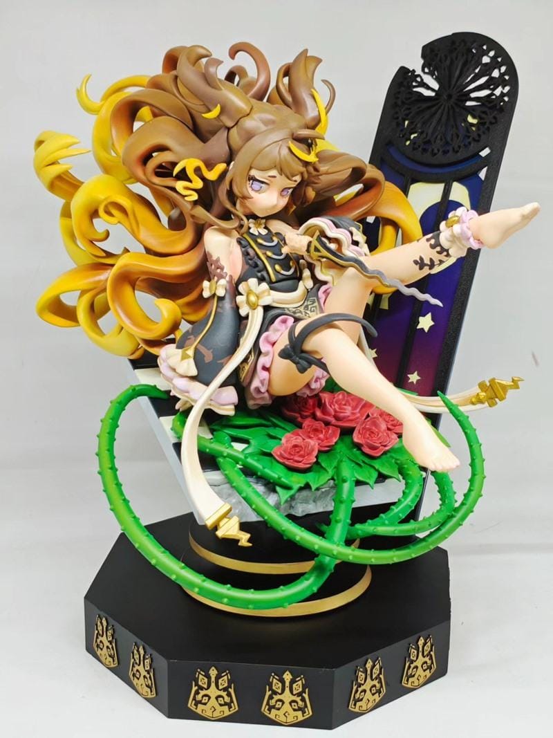 The base of the model is intricately designed, incorporating thorny green vines and vibrant red roses, suggesting a gothic or fantasy theme. A decorative, stained-glass-like panel stands behind her, further enhancing the visual narrative. This detailed sculpt is perfect for collectors and hobbyists looking to add a unique, character-driven piece to their 3D printing collection.