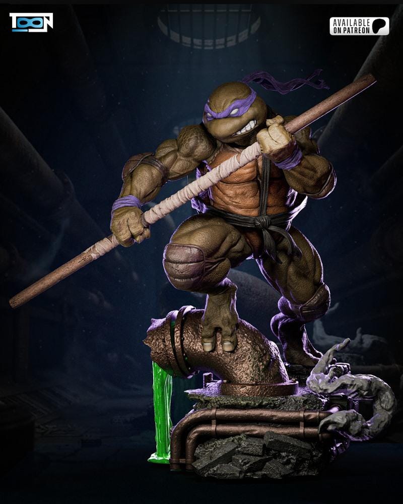 This highly detailed 3D printable model captures Donnie from the Teenage Mutant Ninja Turtles franchise in a dynamic, heroic pose. Standing atop a sewer pipe with glowing green ooze, the character is depicted with a muscular physique and wielding his signature bo staff. The sculpt features intricate texturing on his skin, armor, and the industrial base, showcasing a gritty, realistic interpretation of the beloved character.