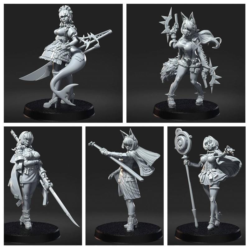 This collection features five distinct 3D printable models, each showcasing a unique female character. The “ZZZ Pack” offers a variety of designs, from a character with a mermaid-like tail and a large sword to a fox-eared warrior wielding dual weapons. Other figures include a samurai-inspired warrior with a katana, a character with a flowing cape and a sword, and a magical girl holding a staff. These models are designed with intricate details, suitable for collectors and hobbyists interested in creating their own tabletop miniatures or display pieces. The pack provides a diverse set of characters, each with a distinct aesthetic and pose, ready for 3D printing.